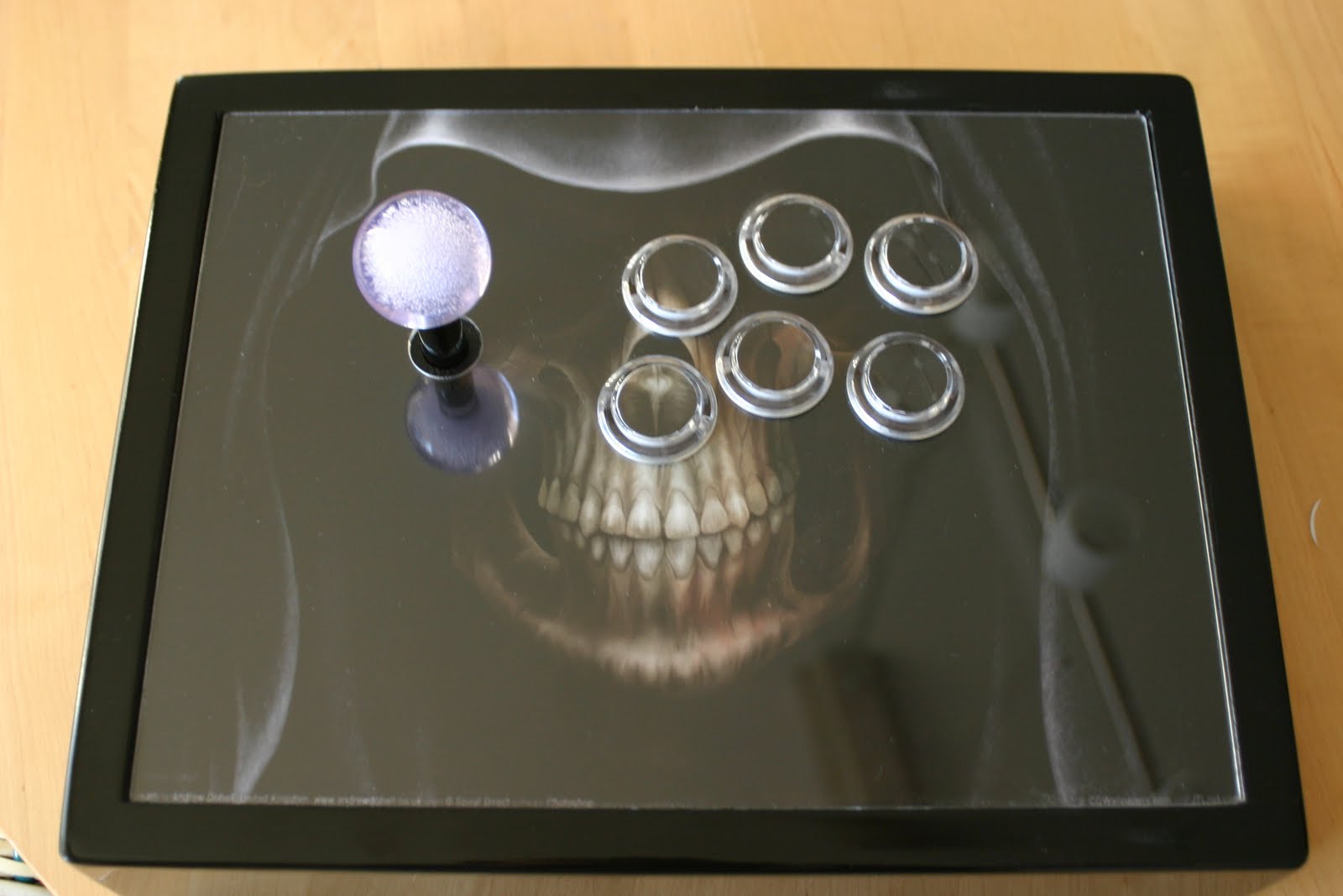 Black mirror Lacquer and laser cut plexi with polished edges. I`ve attached no dust washer, because the polished plexi edges for the joystick hole looks so great. Perhaps a clear washer should attached here.
